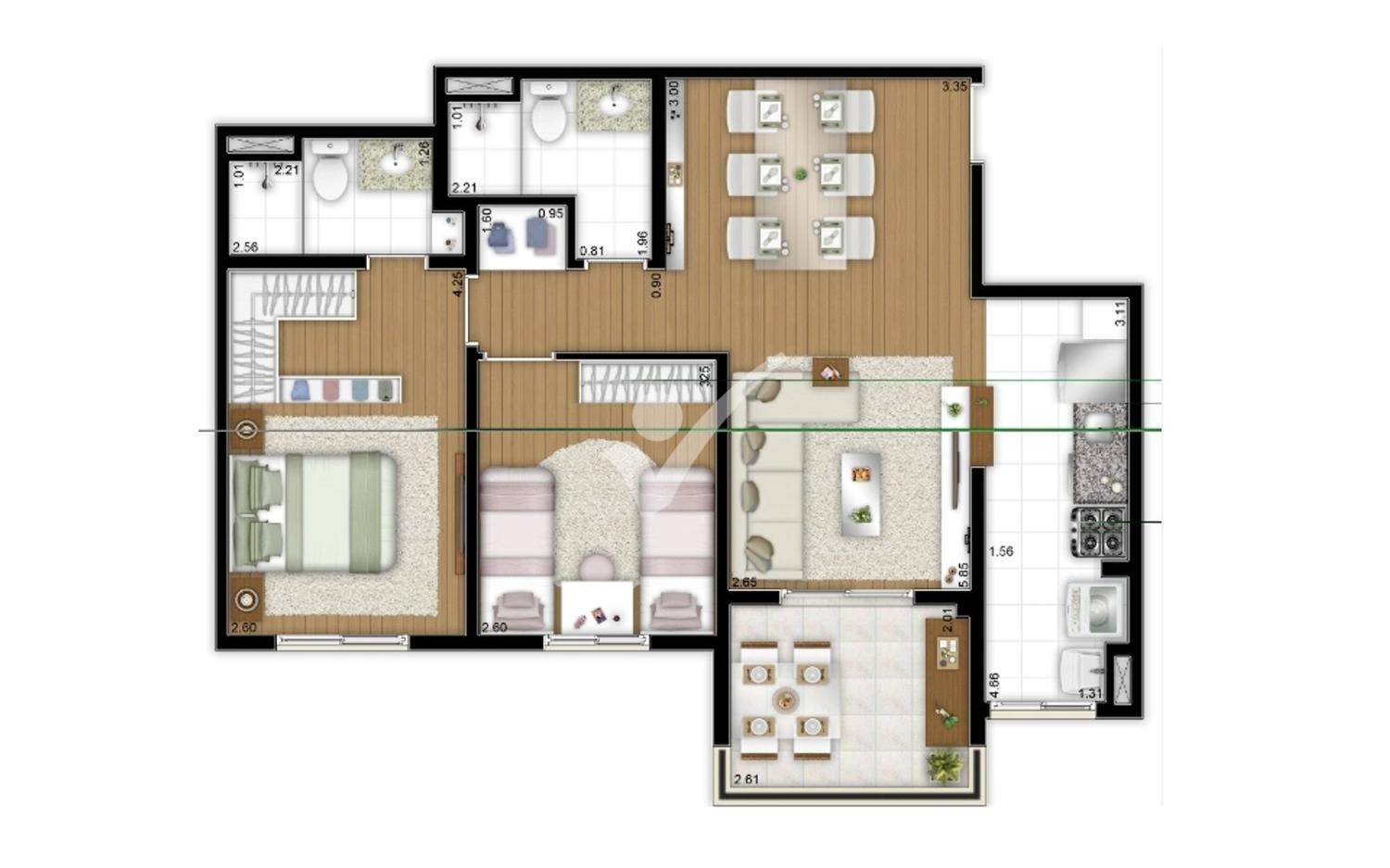 Os apartamentos deste condomínio variam de 43 a 70m², podendo conter até 2 quartos (1 suíte), 2 banheiros, 1 vaga de garagem e elevador.