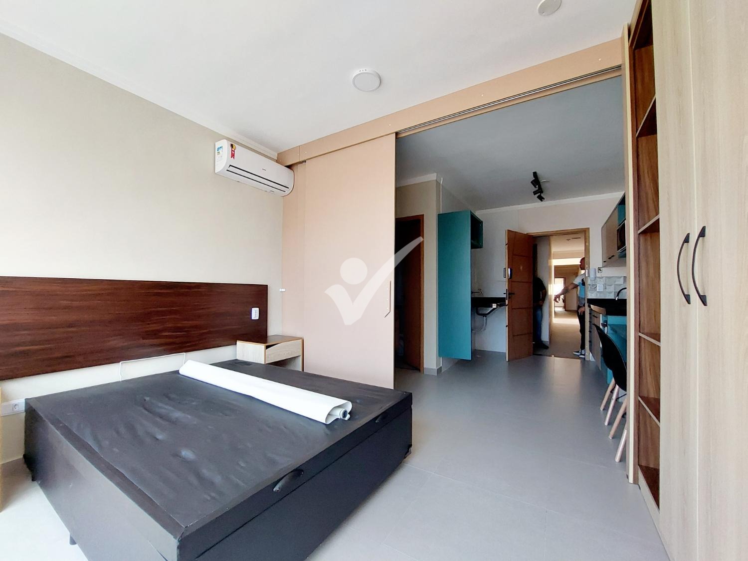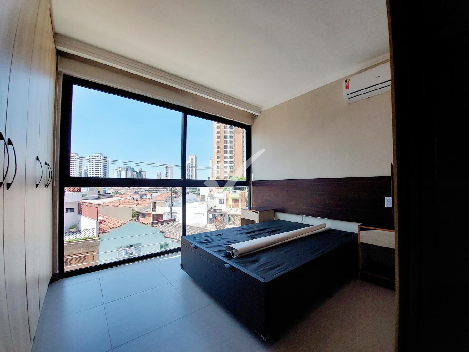 Quarto com cama e guarda roupa;