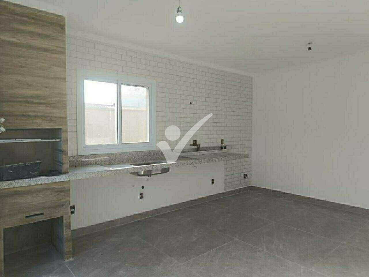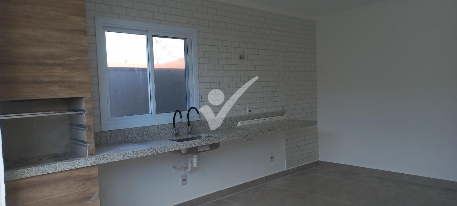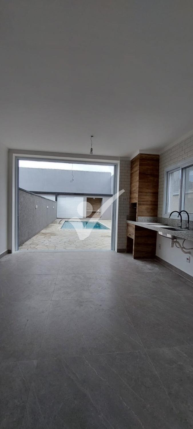 Cozinha com churrasqueira gourmet com porta de acesso para área externa (piscina);